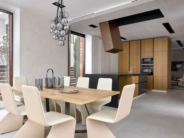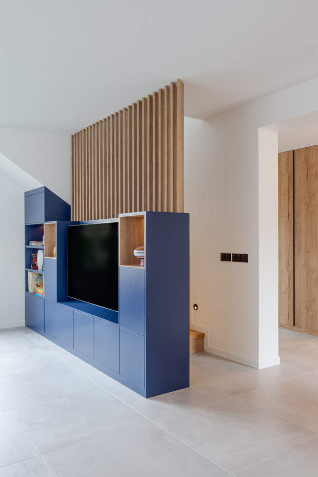 «Смысловым интерьерным элементом дома стал каменный пилон разделяющий гостиную и лестницу. Визуально он представляет собой “прилетевшую с неба” прямоугольную пластину, которая под углом воткнулась в пол и осталась стоять», — объясняют авторы проекта