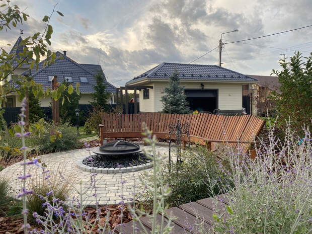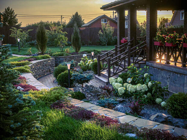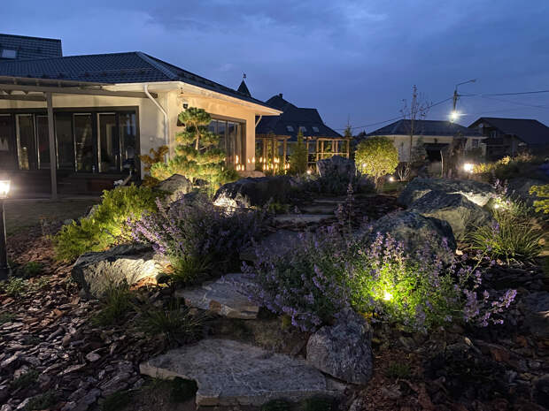 Красота этого сада раскрывается на фоне вечерней подсветки