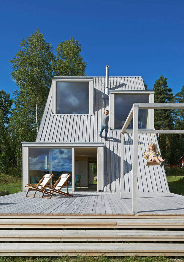 Скандинавы не делают крышу — не перекрывают свет в примыкающие помещения. Идея с качелями, смонтированными в настиле тоже «в копилку»